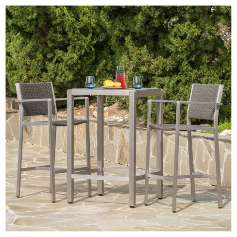 Online shopping for patio, lawn & garden from a great selection of conversation sets, dining sets, bistro sets, bar sets & more at everyday low prices. If you have a swimming pool, these are great tables. To enjoy coffee, a beautiful bar height patio furniture set of in black may be enough, with a high round table, a glass countertop and appropriately high wooden swivel chairs with beige cushions. Sizes and materials measure the height of your table or counter to ensure the stools you choose fit correctly.