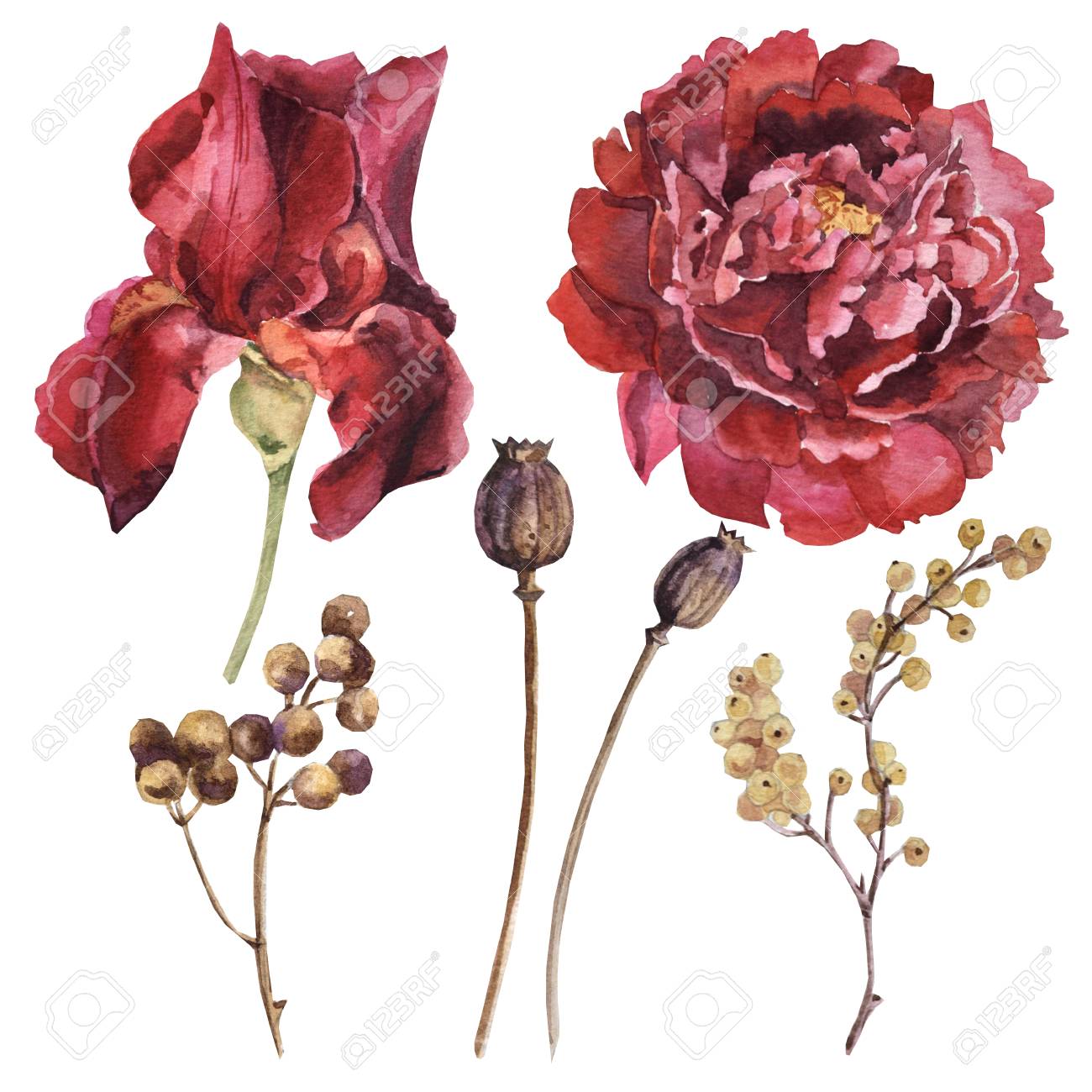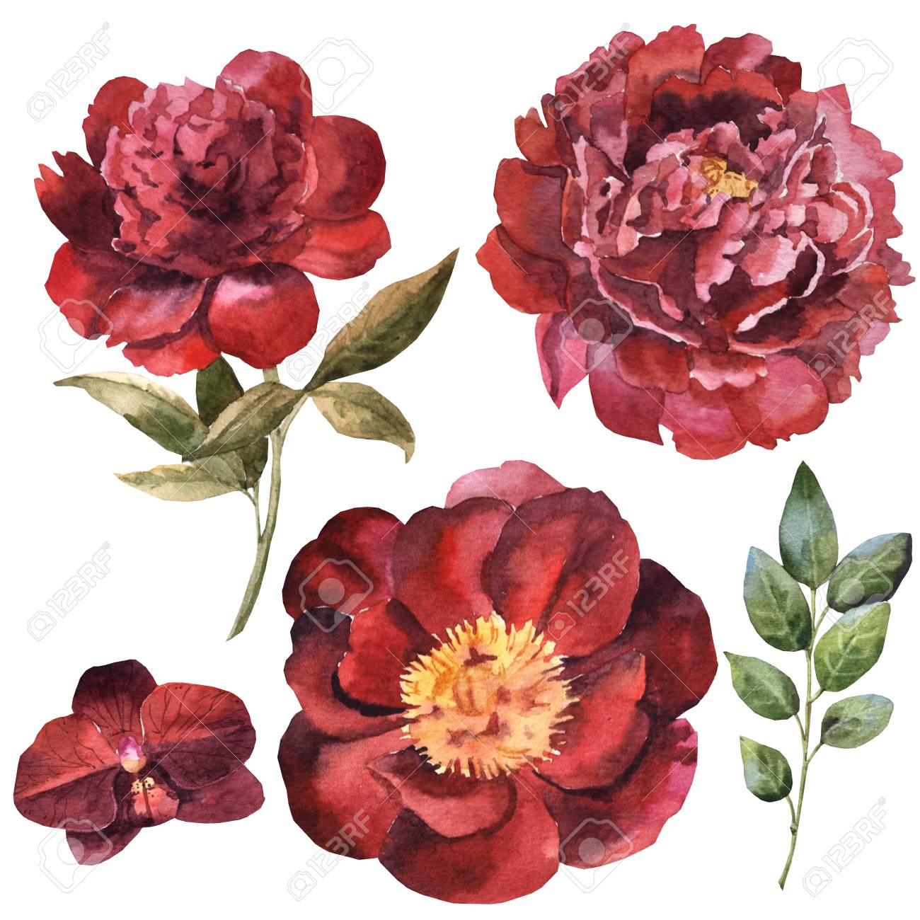 Watercolor Maroon Flower Set Stock Photo Picture And Royalty Free Image Image 109202693 from previews.123rf.com
