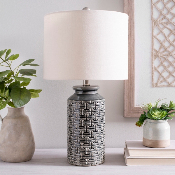 • lamp base shown with small st… Our table lamps are handcrafted from the finest natural materials. Give atmosphere to your room with table lamps that complements the style and decor of your space. The textured ceramic base has a pop of mod patterns on the shade.